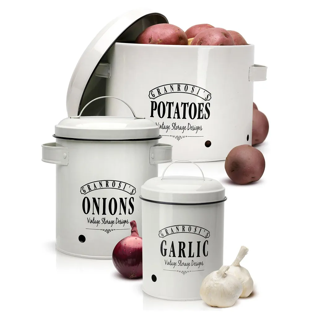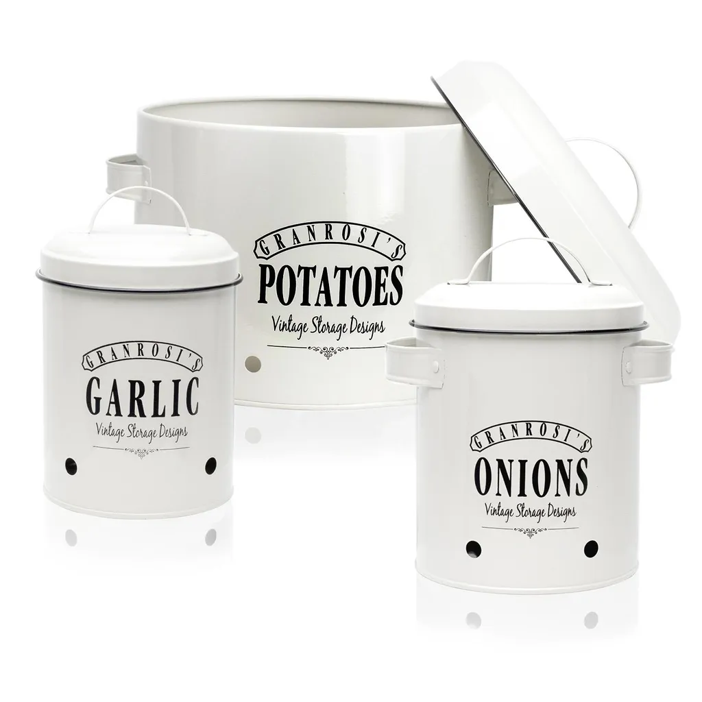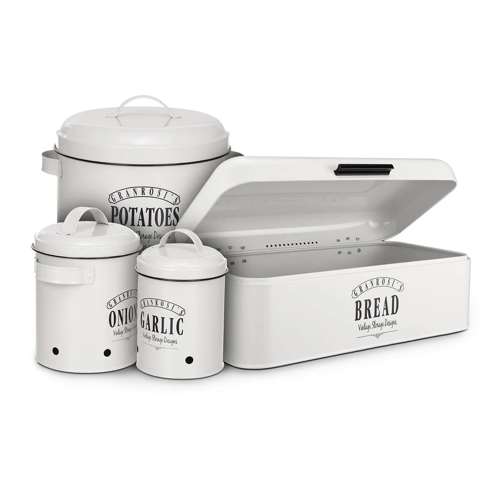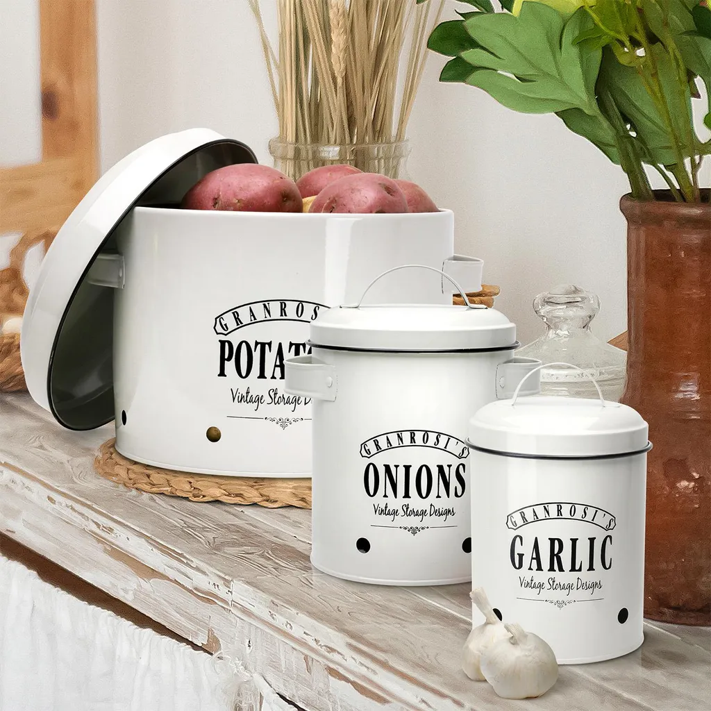 Klarstein Granrosi Georgia Vorratsbehälter Vorratstopf 3er-Set , Knoblauchtopf, Zwiebeltopf, Kartoffeltopf , Emaille-Stahlblech , Rostfrei , Lüftungsöffnungen , Vintage-Design , Creme