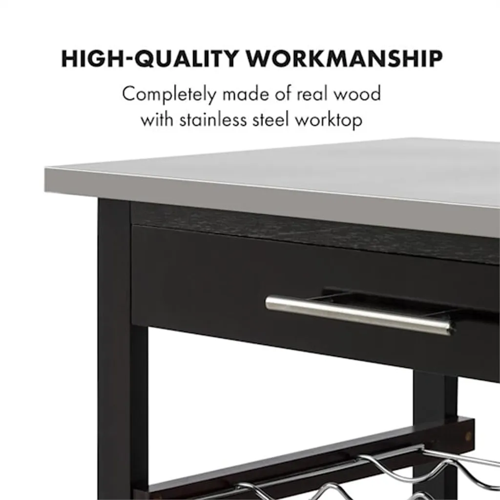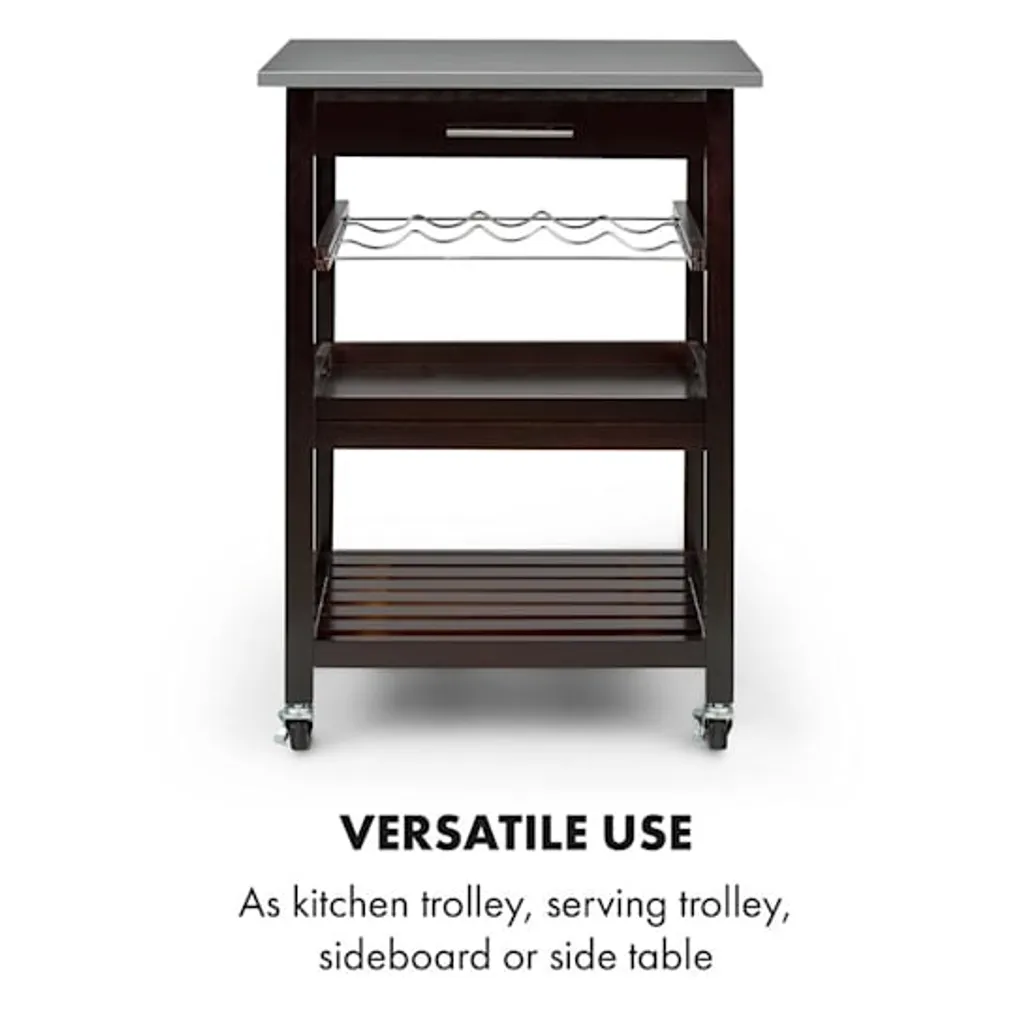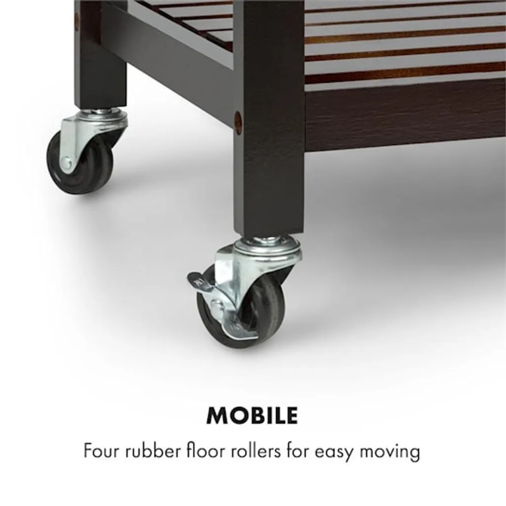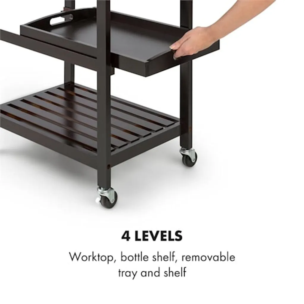 Klarstein Vermont – Küchenwagen, Servierwagen, Küchenrollwagen, 4 Etagen, DREI Ablagen, Herausnehmbare Schublade, Flaschenablage, Edelstahl-Arbeitsplatte, Echtholz, Rollen, Dunkelbraun