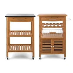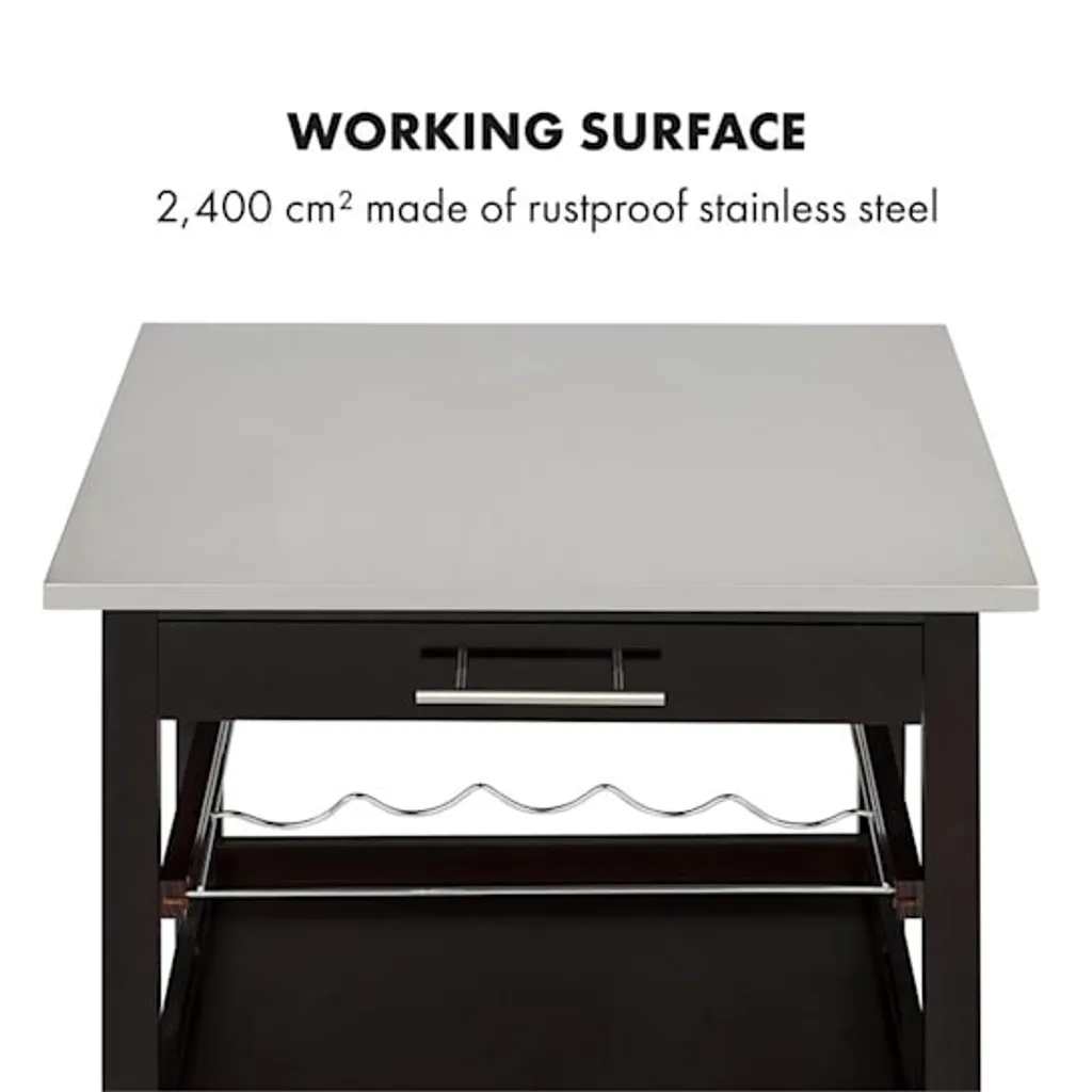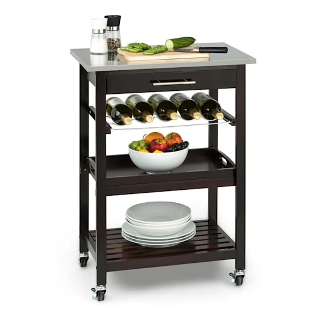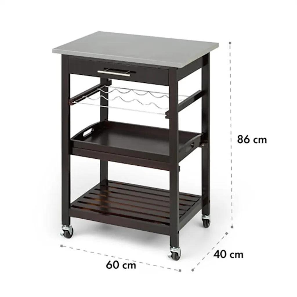 Klarstein Vermont – Küchenwagen, Servierwagen, Küchenrollwagen, 4 Etagen, DREI Ablagen, Herausnehmbare Schublade, Flaschenablage, Edelstahl-Arbeitsplatte, Echtholz, Rollen, Dunkelbraun