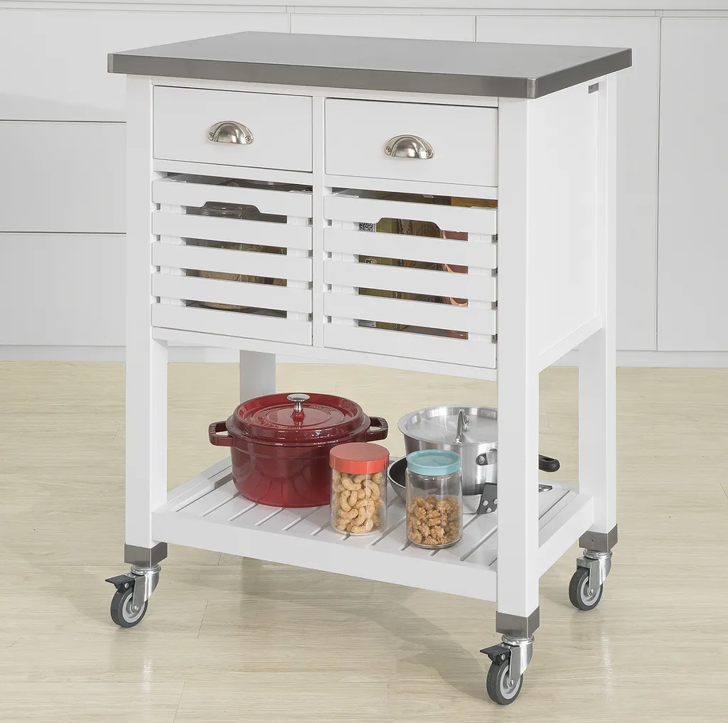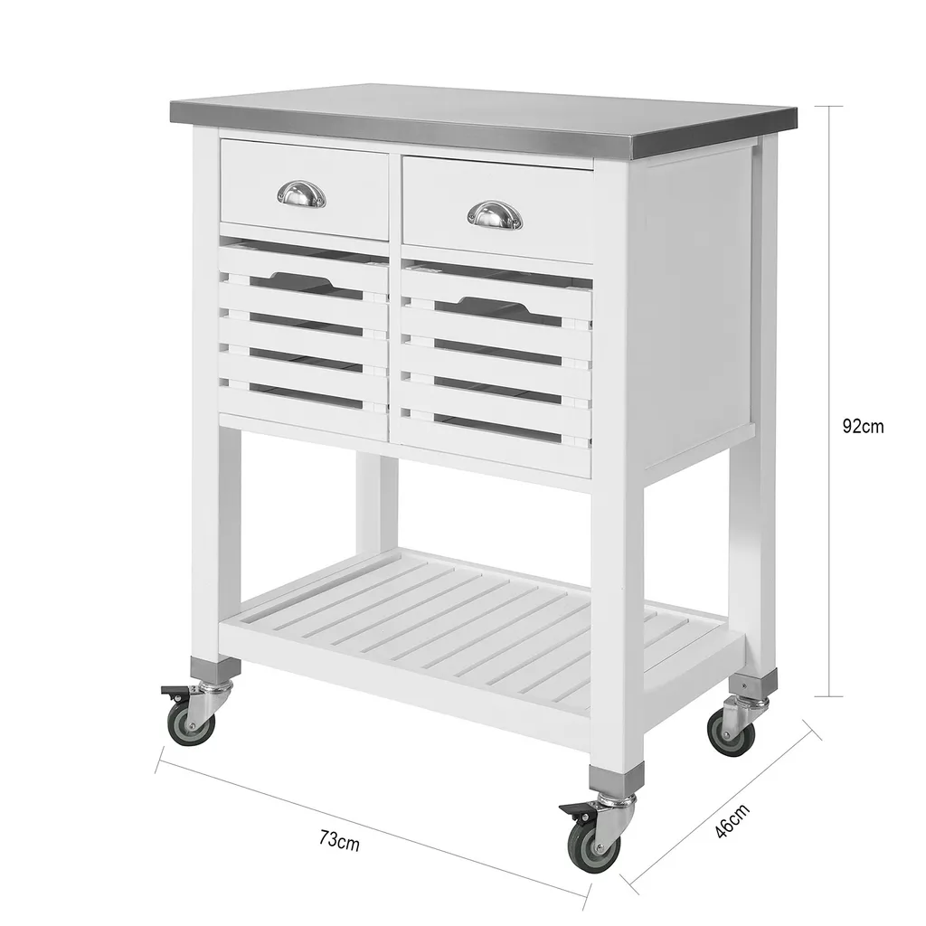 SoBuy FKW83-W Servierwagen Mit 2 Körben Und 2 Schubladen Küchenwagen Küchenschrank Rollwagen Mit Edelstahlplatte Weiß